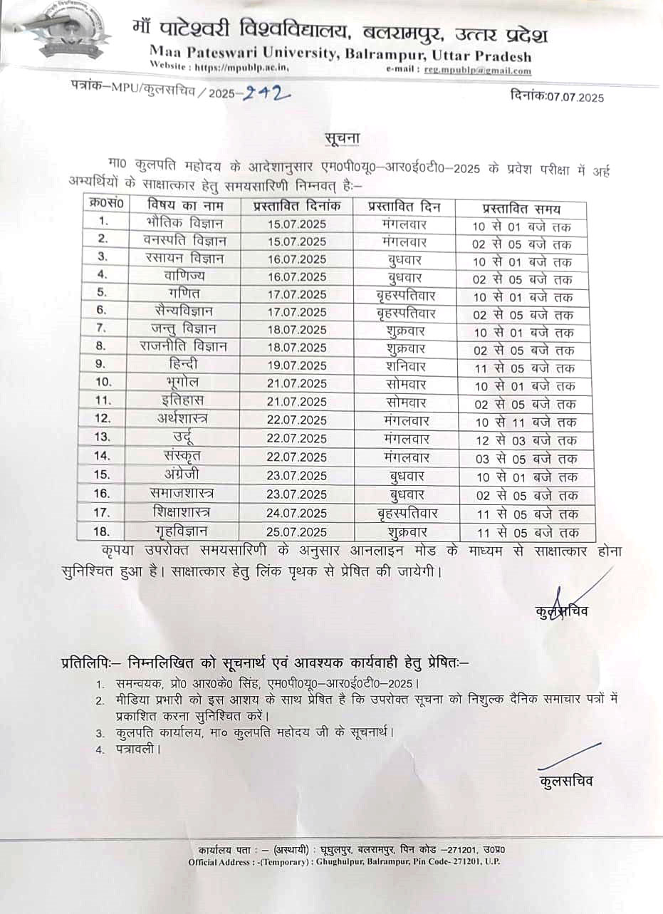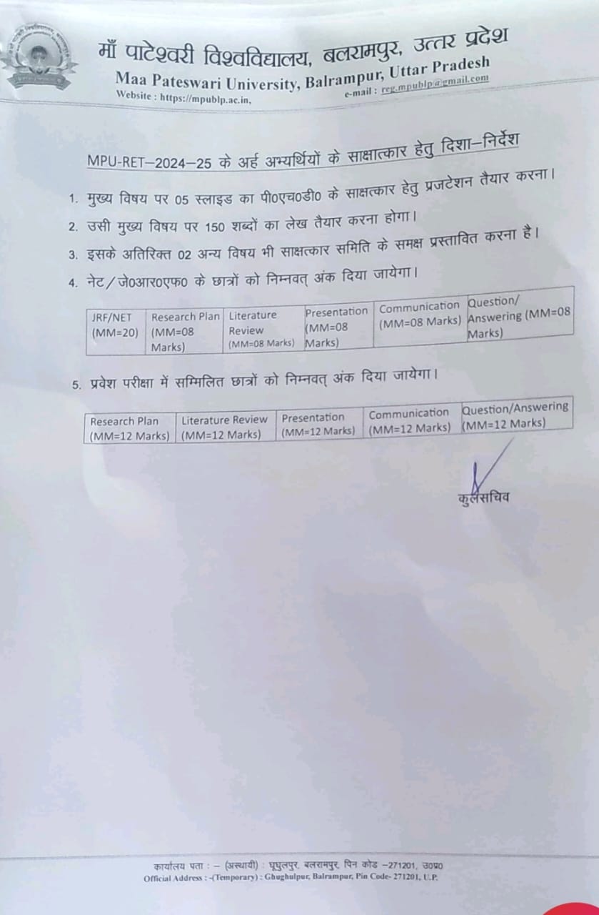 शोध प्रवेश परीक्षा (MPU-RET-2025) के लिए पंजीकरण 7 जून, 2025 से प्रारम्भ हो चूका है। बिना विलंब शुल्क के पंजीकरण की अंतिम तिथि 18 जून, 2025 है और विलंब शुल्क के साथ पंजीकरण की अंतिम तिथि 20 जून, 2025 है। आवेदन करने के लिए यहां क्लिक करें।